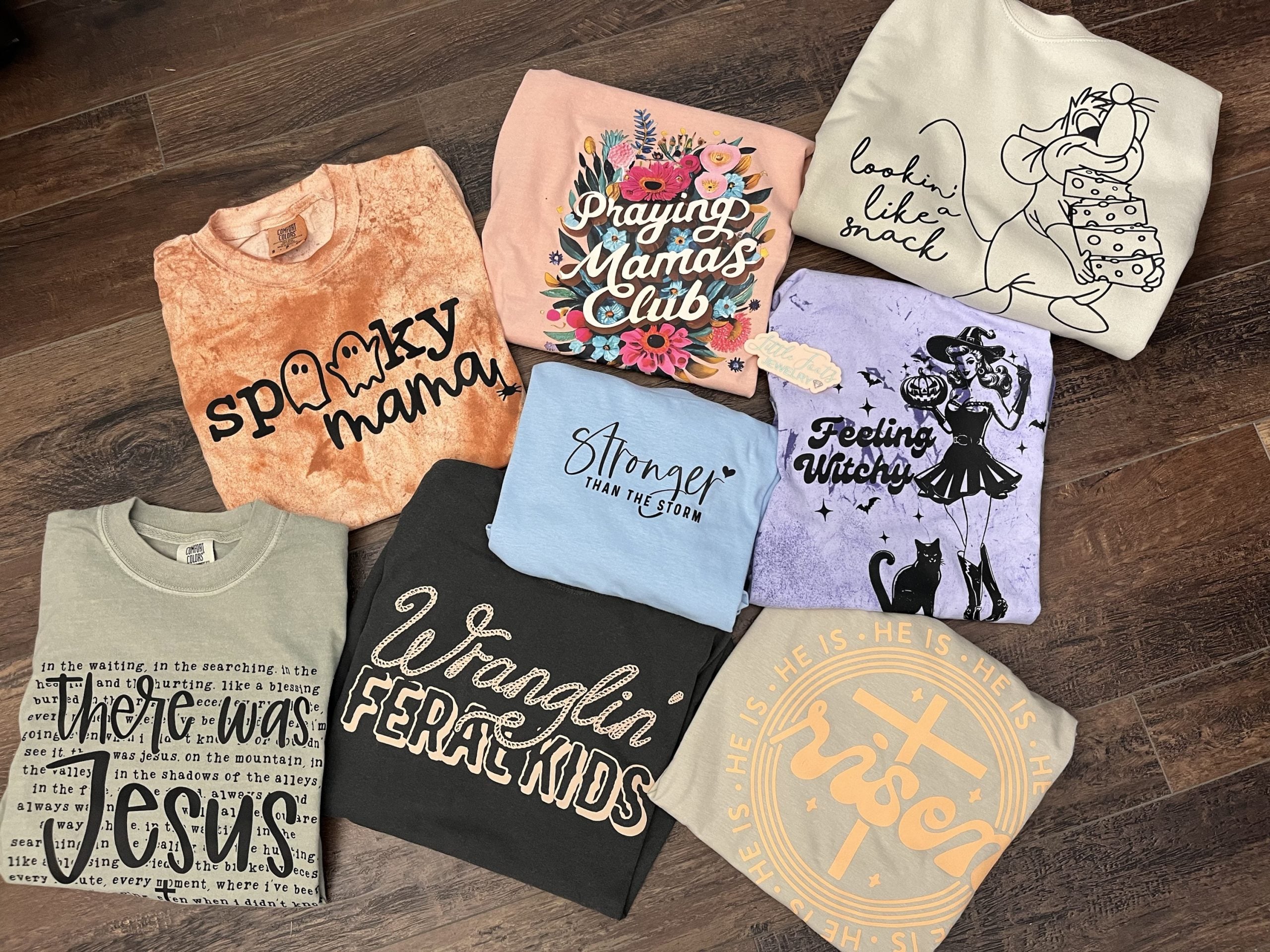 Choose between Comfort Colors T-shirt or Gildan Sweatshirt.